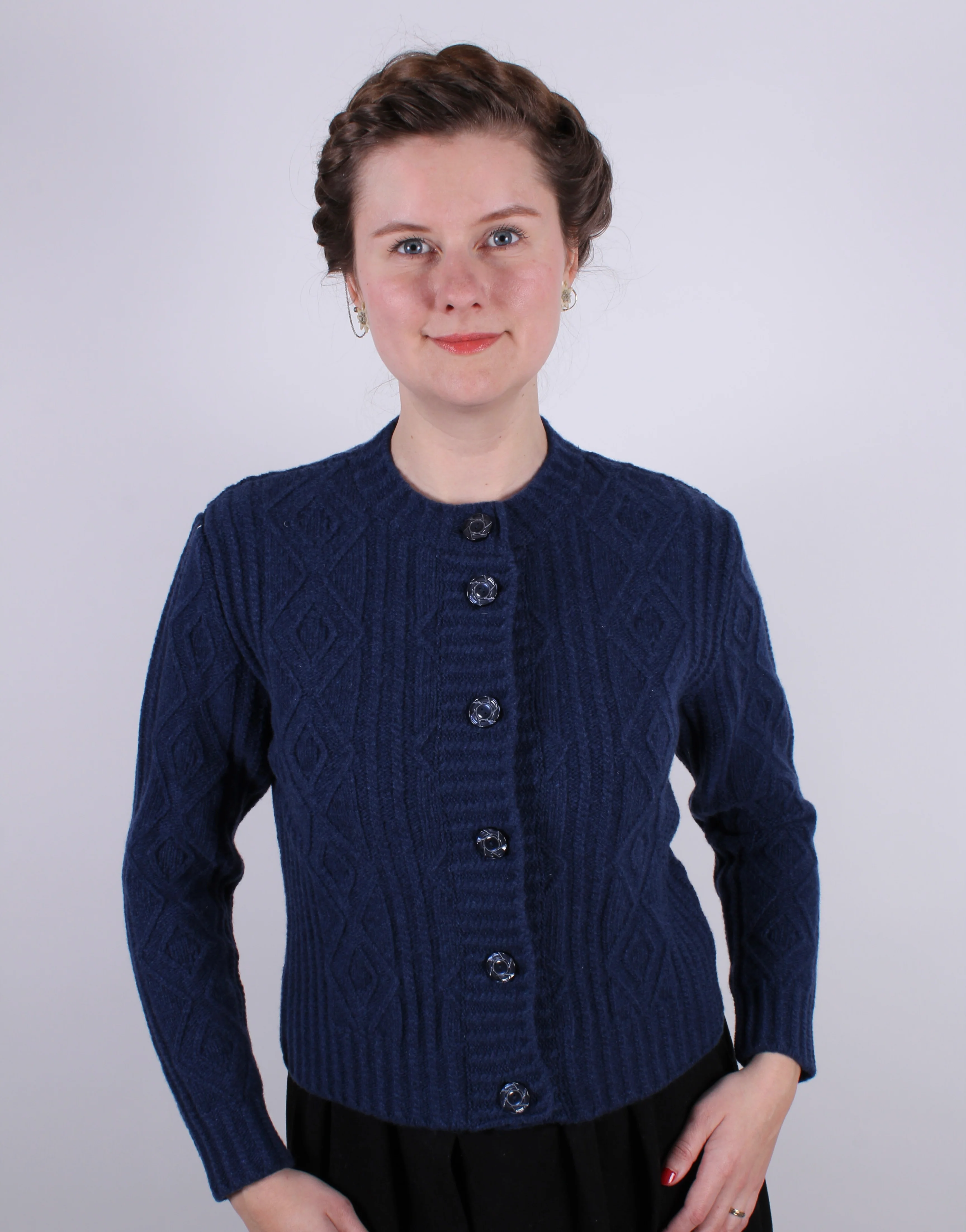 A soft and extra warm, 1940s-inspired classic country-style cardigan made from 100% pure, luxurious merino wool, featuring a beautiful cable knit pattern. The design is simple, feminine, and has a timeless, classic cut. It features a round neckline, a short length that sits just below the waist, and long sleeves.