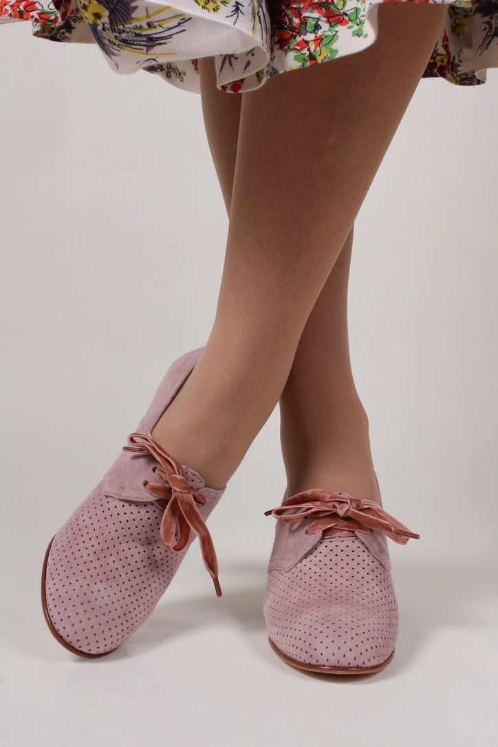 1940s pumps in suede with velvet laces - Powder Rose - Esther