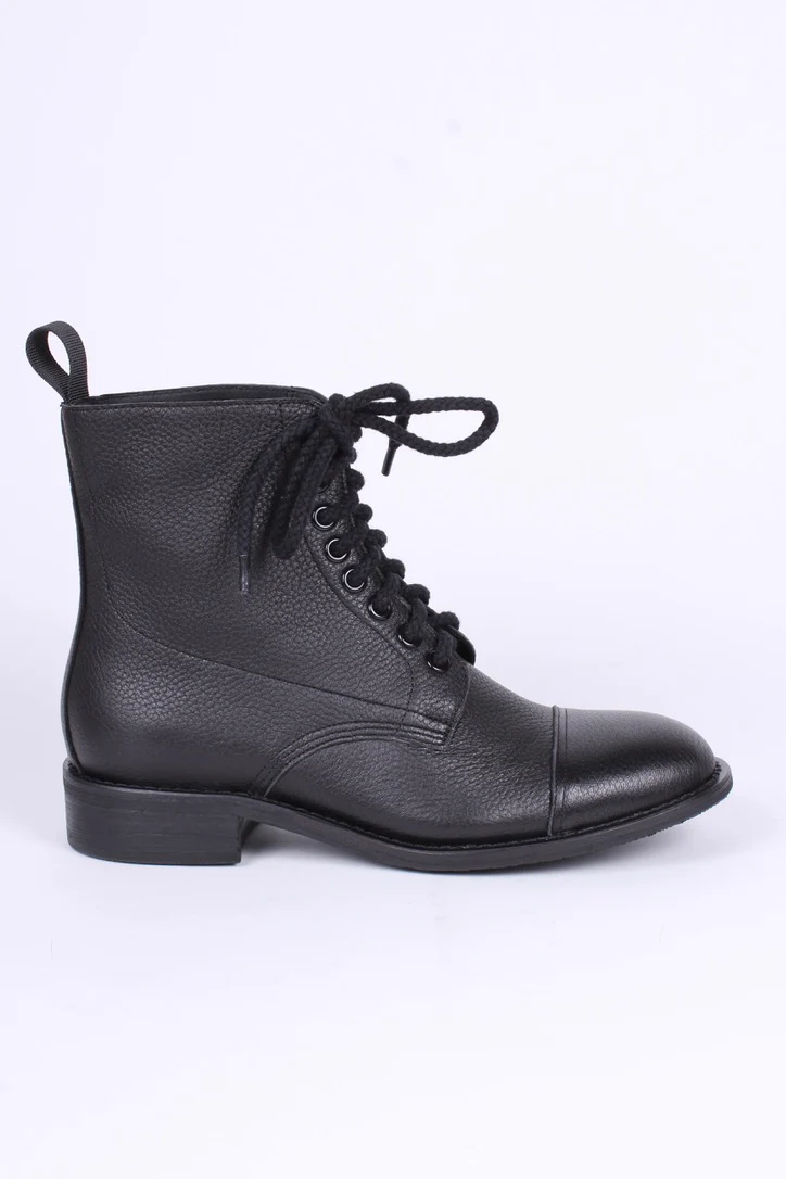 Introducing Robbie, an authentic-looking WWII 1940s-inspired leather lace-up boot. These sturdy, casual boots are crafted from full-grain structured leather and feature a rounded toe cap, a slim-fitting boot shaft, eight pairs of metal eyelets for the laces, and durable rubber outsoles. The 3 cm in high wooden heel is topped with a rubber sole for added durability. Inside, the boots have a leather insole with soft, padded silicone inserts for breathability and comfort.